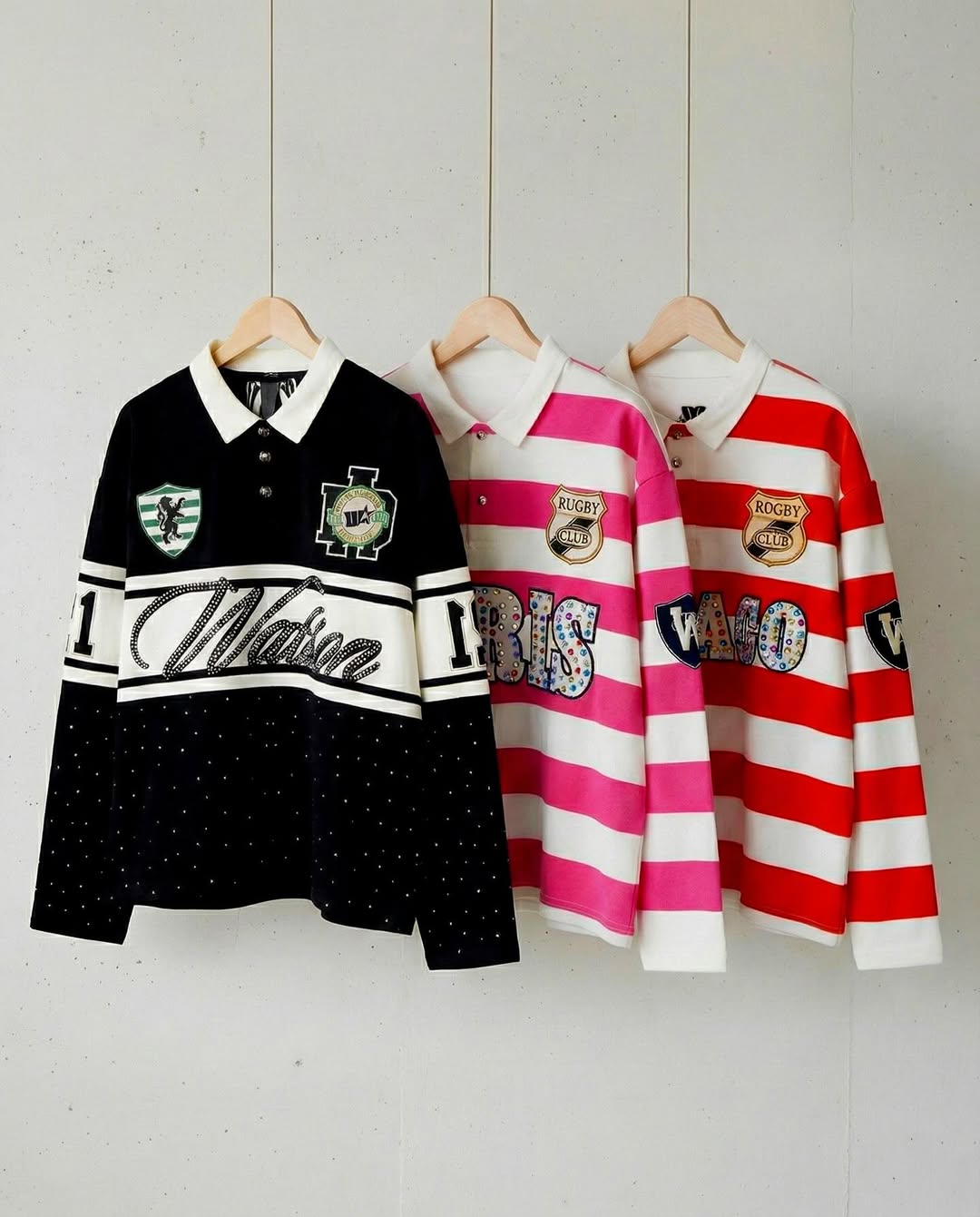 PARIS RHINESTONE STRIPED LONG SLEEVE RUGBY POLO (PINK)